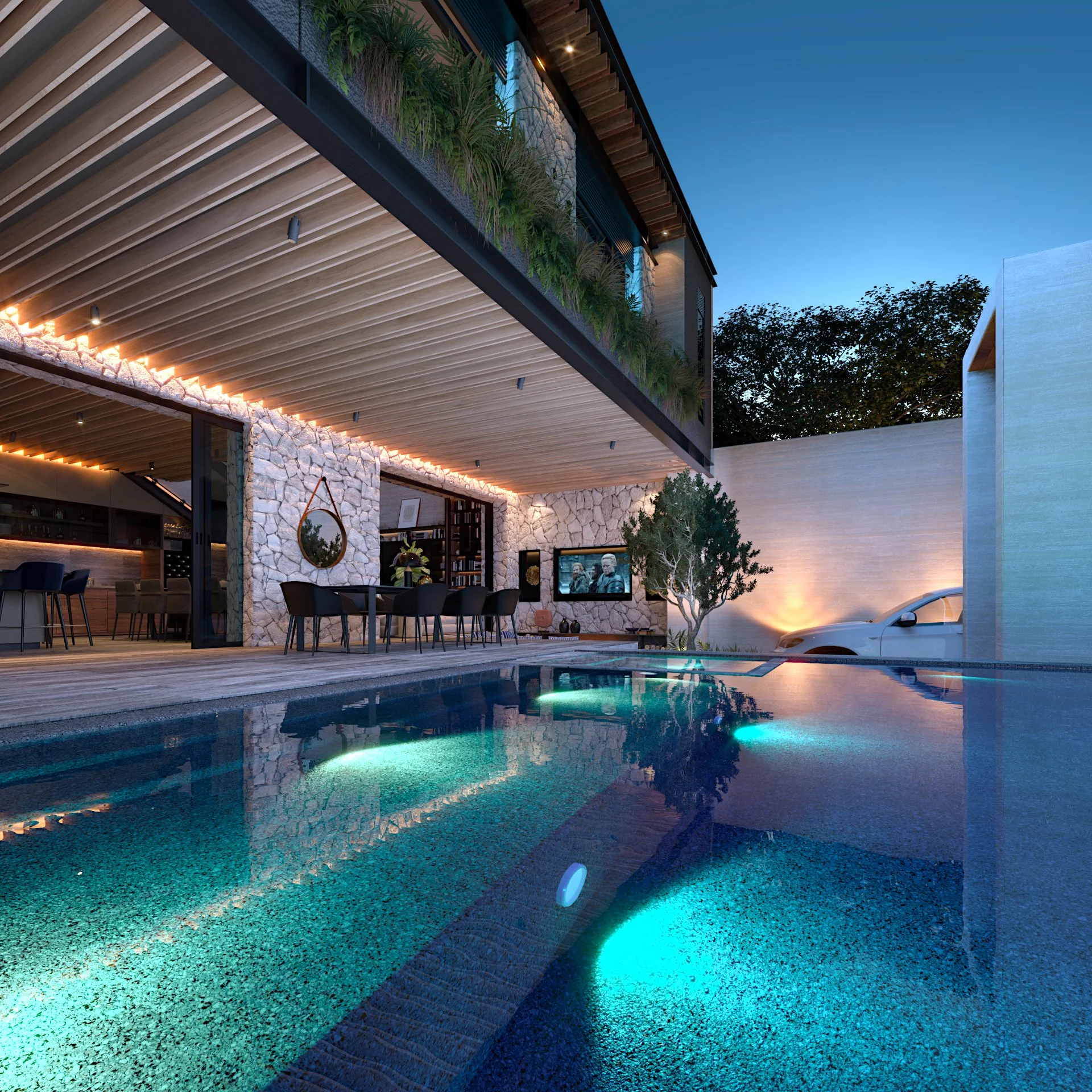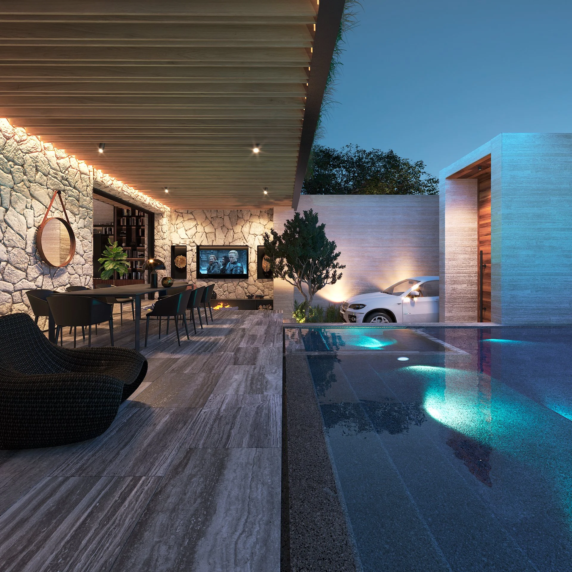 A project with a “Modern Mexican Ranch” style. The integration between indoor and outdoor spaces is the key of the main floor. Travertine combined with regional stone, mixed with certain details achieving a unique style.